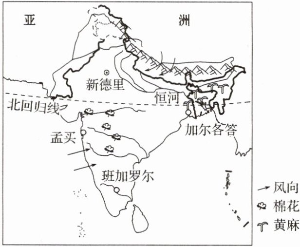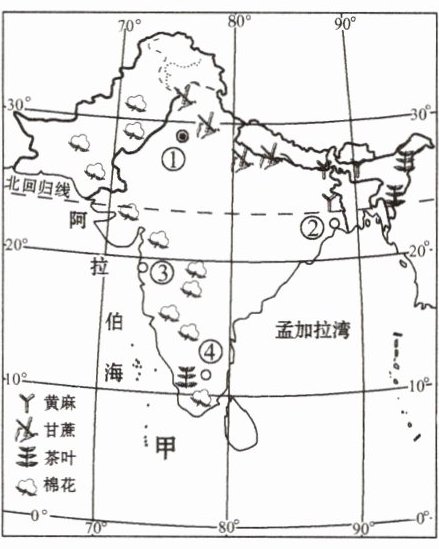 印度位于南亚季风区,气候类型是热带季风气候,主要特点是全年高温,降水明显分旱、雨两季。读印度盛行风向图和部分农作物分布图,完成3~4题。