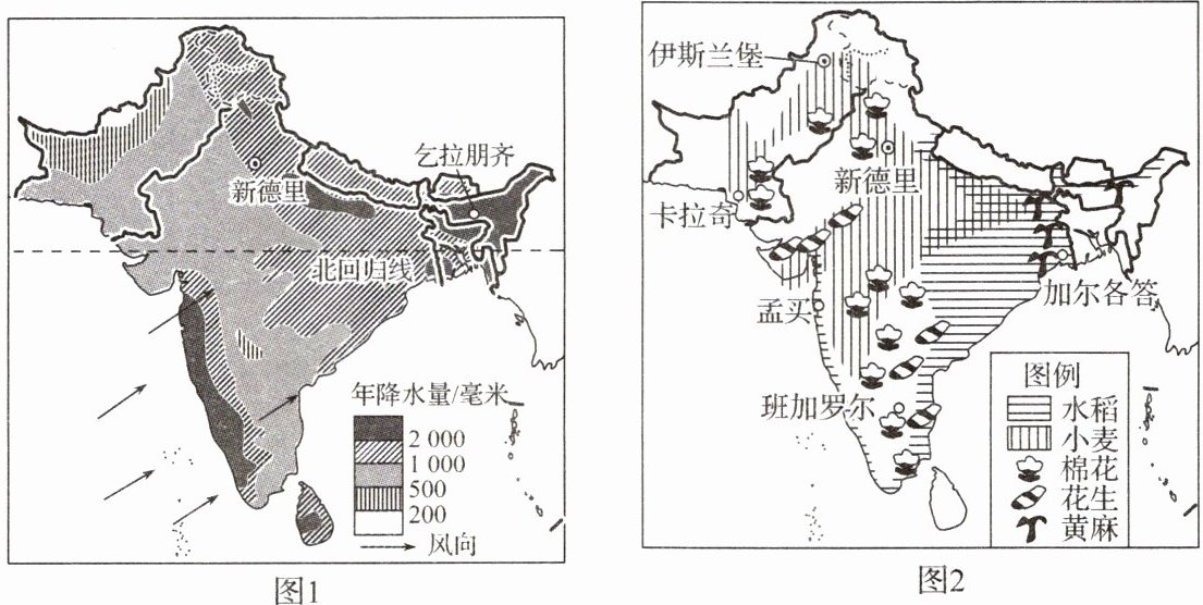 (2022.菏泽学业考)热带季风气候对南亚的农业生产有着重要影响。读南亚年降水量分布图(图1)和南亚主要农作物分布图(图2),完成5~6题。