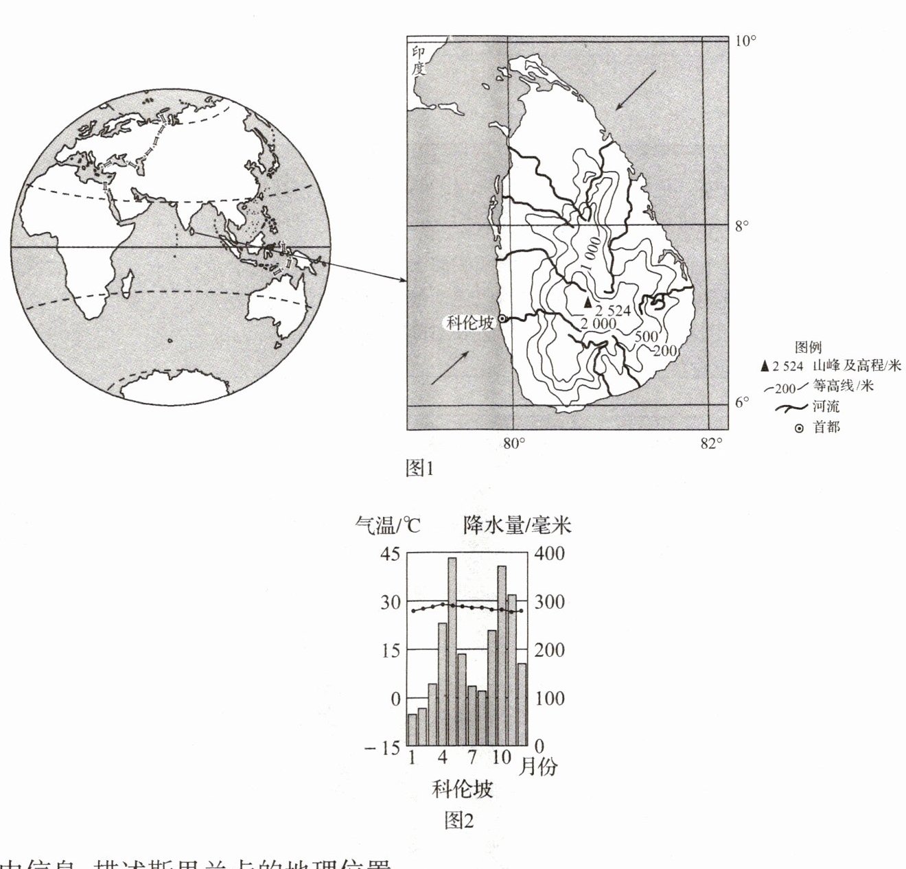 材料三 图1是斯里兰卡的位置和地形图,图2是科伦坡多年平均各月气温曲线与降水量柱状图。