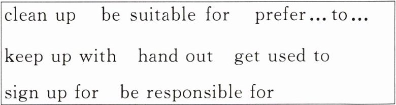 clean up; be suitable for; prefer...to...; keep up with; hand out; get used to; sign up for; be responsible for