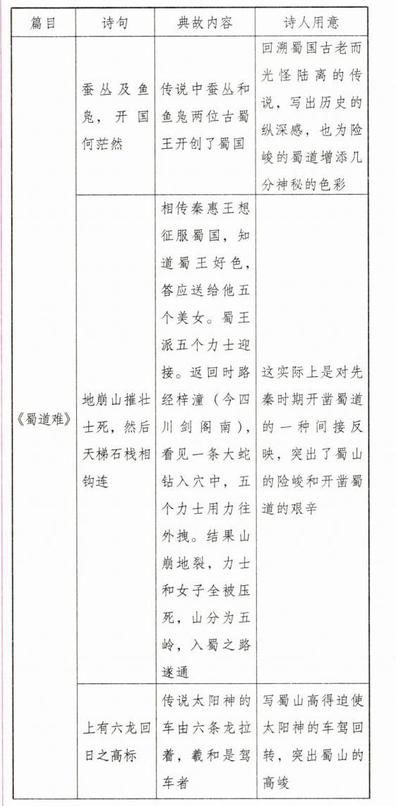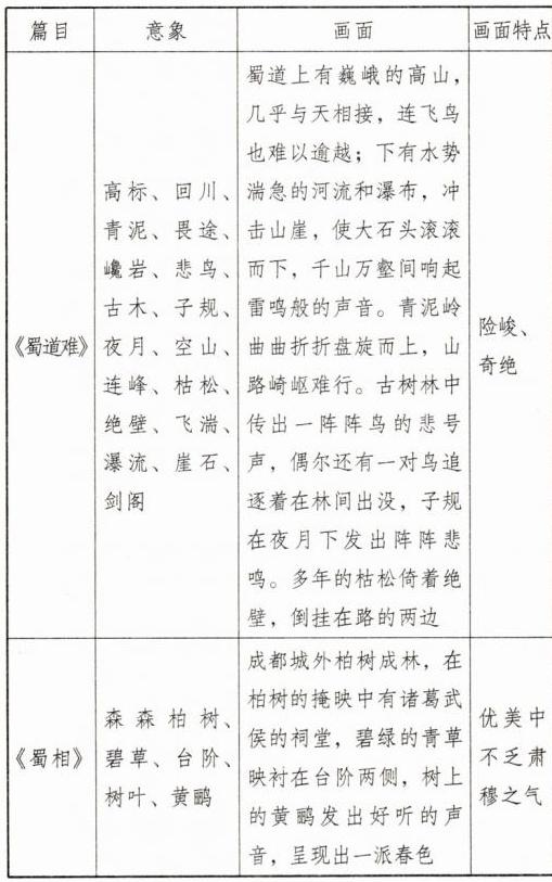 今天的蜀地与李白、杜甫所描绘的已经有很大不同,但仍然会留存诗中一些景物特点,而诗中所写的人文典故,则历久弥新,穿越岁月的风烟而绽放出更加夺目的光泽,引得后人频频回首。梳理两首诗的具体内容,完成下面两个表格。