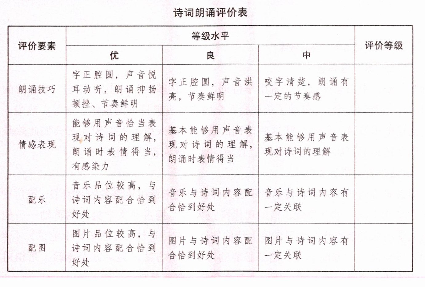 “诗词朗诵评价表”可以在朗诵活动开展之前由全班同学讨论确定,以指导个人诵读、小组内推选优秀诵读者。