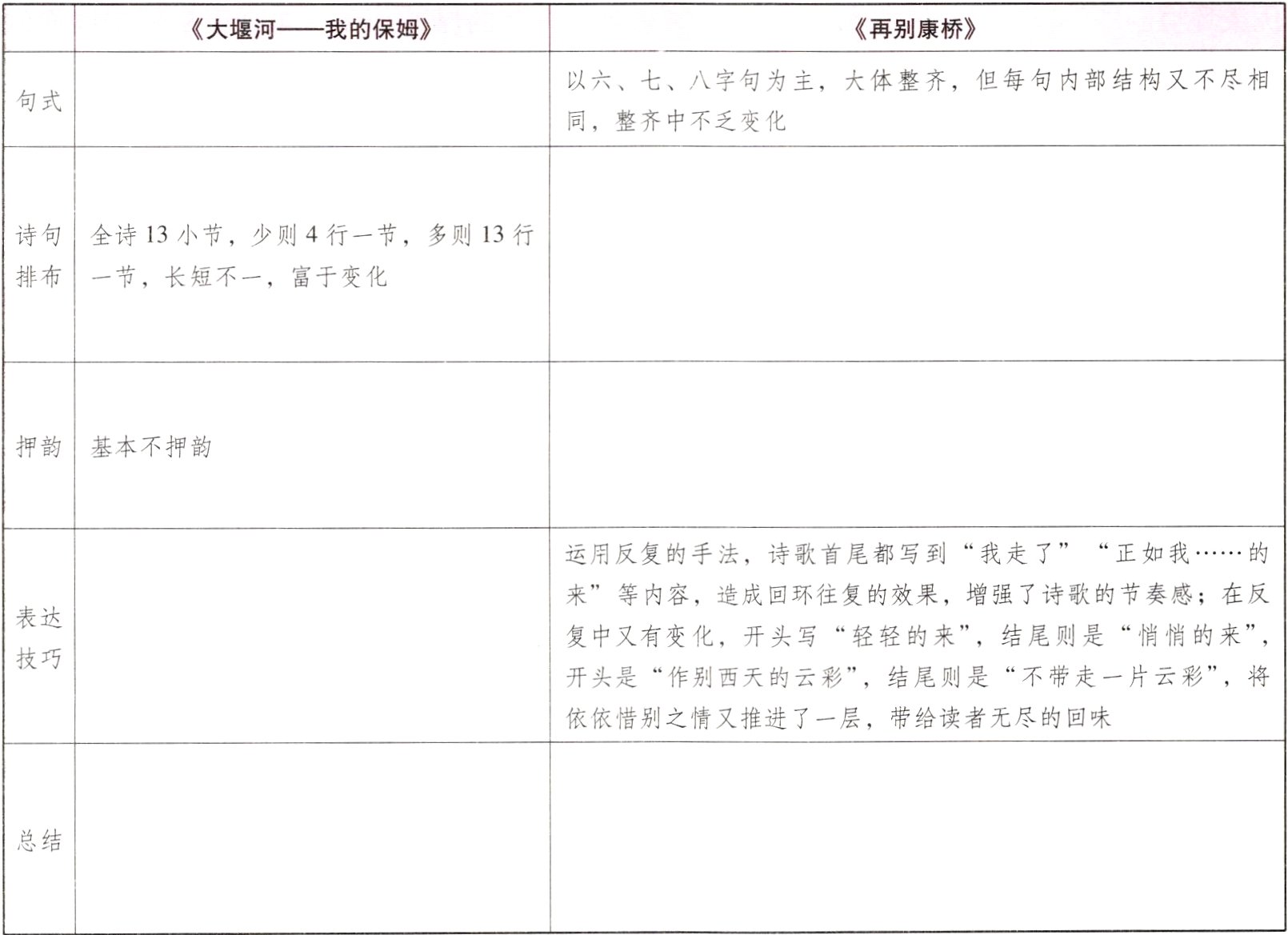 《大堰河——我的保姆》和《再别康桥》没有古典诗词格律的束缚,但又有别于初期白话诗的奔放自由,在形式的自由与限制之间取得了较好的平衡。反复诵读诗歌,体会两首诗在表现形式上有哪些美的体现,完成下面表格。