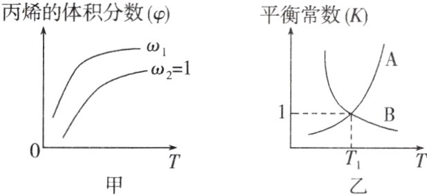 C $\omega$增大,可认为$CH_2 = CHCH_3$不变,增加$Cl_2$的量,平衡向右移动,$CH_2 = CHCH_3$的转化率增大,则$\varphi$减小,由上述分析可知:$\omega_2 > \omega_1$,则$\omega_1 < 1$;该反应在反应前后气体分子数不变,根据图甲升高温度丙烯的体积分数增大,即升高温度平衡逆向移动,正反应放热,在恒容绝热装置中进行题述反应,体系内温度升高,根据$pV = nRT$,达到平衡时,装置内的气体压强将增大;由图乙可知,$T_1$时平衡常数为1,设起始时$CH_2 = CHCH_3$和$Cl_2$的物质的量分别为a mol和2a mol,达到平衡时转化的$Cl_2$的物质的量为x mol,根据三段式进行计算: