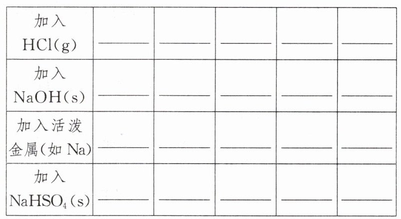 分析下列条件的改变对水的电离平衡$H_{2}O\rightleftharpoons H^{+}+OH^{-}$ $\Delta H>0$的影响,并填写下表:
