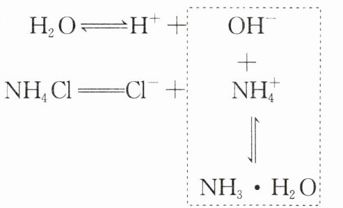 |理论解释|$NH_{4}^{+}$和$OH^{-}$结合生成弱电解质$NH_{3}\cdot H_{2}O$,使水的电离平衡向电离方向移动,使溶液中$c(H^{+})$____$c(OH^{-})$|