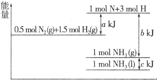 D 根据能量变化示意图可写出如下热化学方程式$\frac{1}{2}$N₂(g)+$\frac{3}{2}$H₂(g)=NH₃(g) ΔH = (a - b)kJ/mol $\frac{1}{2}$N₂(g)+$\frac{3}{2}$H₂(g)=NH₃(l) ΔH = (a - b - c)kJ/mol,由此可判断D项正确。