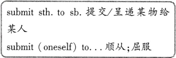 6. submit vt.&vi. 提交;呈递;屈服 [submissive adj. 服从的,顺从的,恭顺的;submission n. 提交(物);呈递(书);屈服]