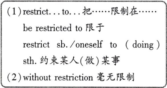 3. restrict vt. 限制;限定;束缚 (restriction n. 限制规定,限制法规;约束;restricted adj. 有限的;受限制的;restrictive adj. 限制性的;约束性的)