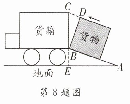 8.[2024·武汉]如图是将一正方体货物沿坡面AB装进汽车货厢的平面示意图,已知长方体货厢的高度BC为2米,斜坡AB的坡度i = $\frac{1}{3}$,现把图中的货物沿斜坡继续往前平移,当货物顶点D与C重合时,恰好可把货物放平装进货厢,则BD = ________.