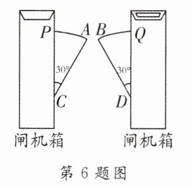 6.[2023·常州二模]如图是一个地铁站入口的双翼闸机.它的双翼展开时,双翼边缘的端点A与B之间的距离为10 cm,双翼的边缘AC = BD = 54 cm,且与闸机侧立面夹角∠PCA = ∠BDQ = 30°.当双翼收起时,可以通过闸机的物体的最大宽度为________cm.