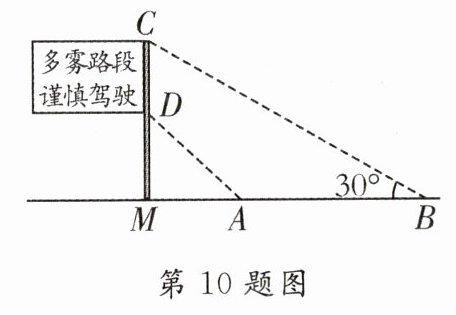 10.[2024·海门区一模]如图是矗立在高速公路水平地面上的交通警示牌,经测量得到如下数据:AM = 4米,AB = 8米,∠MAD = 45°,∠MBC = 30°,则警示牌的高CD为________米.(结果精确到0.1,参考数据:$\sqrt{2}=1.41$,$\sqrt{3}=1.73$)