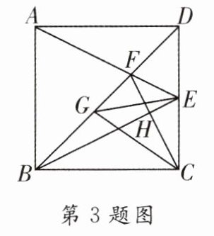 3. [2024·包头模拟]如图,在边长为2的正方形ABCD中,点E为CD边中点,连接AE,AE与对角线BD交于点F,连接CF,BE,且CF与BE交于点H. 则下列结论:①AE = BE ②BE⊥CF ③若点G是BD上的一动点,连接CG,GE,则CG + GE最小值是$\sqrt{5}$ ④$\frac{FH}{EH}=\frac{4}{3}$. 其中正确的序号是________.