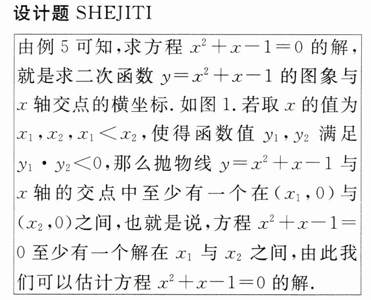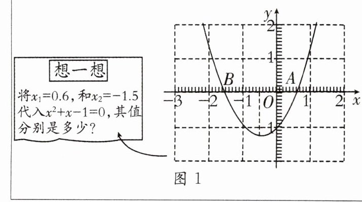 解:设$y = x^{2}+x - 1$,则方程$x^{2}+x - 1 = 0$的解就是该函数图象与$x$轴交点的横坐标. 在直角坐标系中画出函数$y = x^{2}+x - 1$的图象,得到与$x$轴的交点为$A$,$B$,则点$A$,$B$的横坐标$x_{1}$,$x_{2}$就是方程的解. 观察图1,得到点$A$的横坐标$x_{1}\approx0.6$,点$B$的横坐标$x_{2}\approx - 1.5$. 所以方程$x^{2}+x - 1 = 0$的近似解为$x_{1}\approx0.6$,$x_{2}\approx - 1.5$.