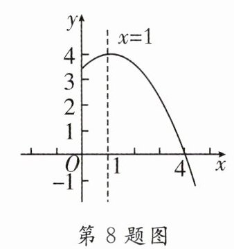 8. [2024·峄城区二模]抛物线$y = ax^{2}+bx + c(a\neq0)$的部分图象如图所示,与$x$轴的一个交点坐标为$(4,0)$,抛物线的对称轴是直线$x = 1$.下列结论:①$abc>0$ ②$2a + b = 0$ ③$4a - 2b + c = 0$ ④方程$ax^{2}+bx + c = 2$有两个不相等的实数根 ⑤若点$A(m,n)$在该抛物线上,则$am^{2}+bm + c\leqslant a + b + c$.其中正确的个数有( )