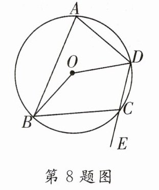 8. 如图,∠BCE是⊙O内接四边形ABCD的一个外角,连接OB,OD,若∠BOD = 144°,则∠BCE的度数为______°.