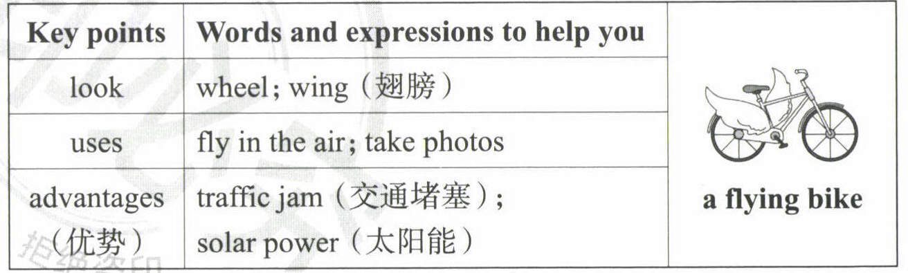 81.(期中·石家庄二十八中)假如你发明的“飞行单车”在学校科技节中获奖,被推荐参加一个国际青少年科技展览。请根据表格中的要点提示用英语介绍你的发明。
