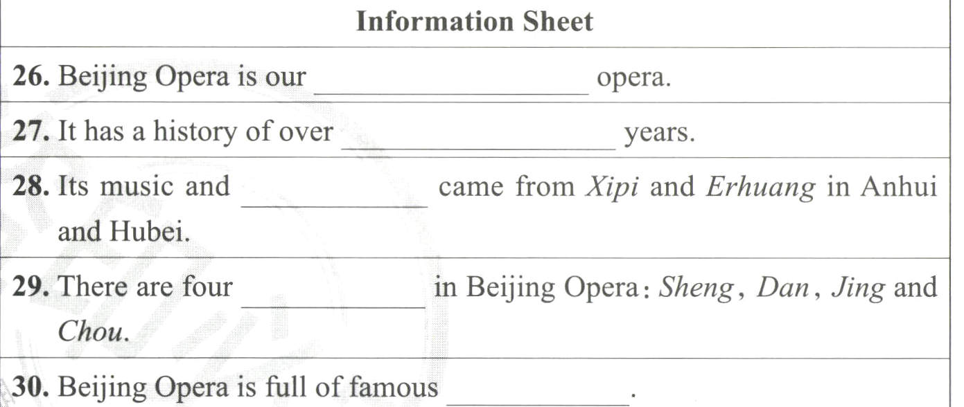 26. national 27. 200/two hundred 28. singing 29. roles 30. stories