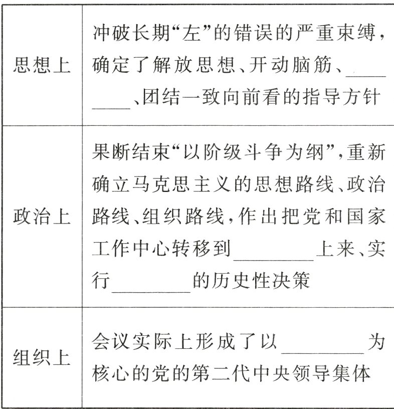 2.完成标志:1981年,中共____________召开,通过了《关于建国以来党的若干历史问题的决议》,标志着中国共产党在________上的拨乱反正胜利完成。