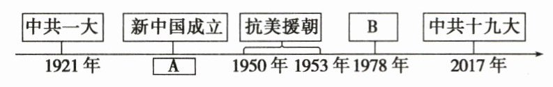 (1)请运用所学完成时间轴上史实的梳理。中共一大召开于哪座城市?这次会议的召开标志着什么?写出A处的具体时间。列举一位抗美援朝战争中的战斗英雄。B处会议开启了改革开放和社会主义现代化建设新时期,B处会议的名称是什么?在中共十九大上,被确立为中国共产党必须长期坚持的指导思想的思想理论是什么?