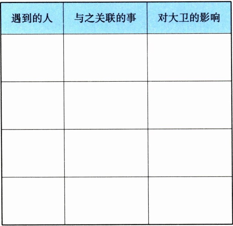 2. 课文节选部分主要叙述了大卫在谋得斯通 - 格林比货行做童工的一段经历。在这段时间里,大卫遇到了一些人,经历了一些事,这对他的成长产生了重要的影响。请根据课文内容,完成下表。