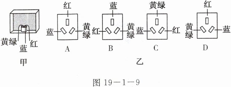 12. 如图19 - 1 - 9甲所示,墙壁上线盒内有三根电线,其中红色为火线、蓝色为零线、黄绿色为地线,现将三孔插座与三根电线连接,图19 - 1 - 9乙中接线情况正确的是 ( )