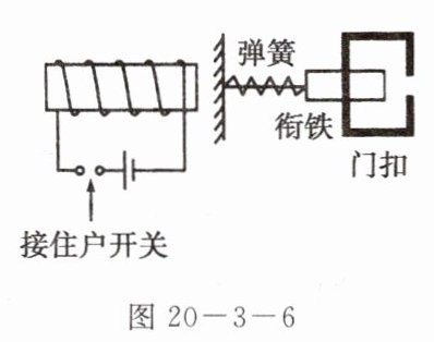 13. 如图20 - 3 - 6是一种单元防盗门锁的原理图,其工作过程是:当有人在楼下按门铃时,楼上的人闭合开关,门锁上的电磁铁通电________衔铁,衔铁脱离门扣,这时来人拉开门,进入楼内,在关门时,开关是断开的,衔铁在________的作用下,合入门扣,在合入门扣的过程中,________能转化为________能.