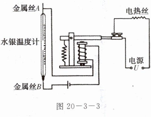 9. 如图20 - 3 - 3所示为某校科技活动小组制作的恒温箱的电路示意图,电热丝是恒温箱的加热元件.图中的水银温度计为导电温度计,上面的金属丝A的高度可以调整,下面的金属丝B与温度计中的水银接触,该温度计的水银液泡被放置到恒温箱内,请根据此电路图说明恒温箱工作的原理.