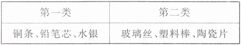 13. 现有六种物品:铜条、玻璃丝、铅笔芯、水银、塑料棒、陶瓷片. 小明将它们分成两类,如下表. 小明是按物质的哪种物理属性对它们进行分类的( )