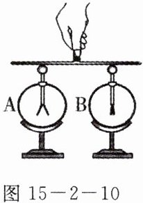 19. 如图15 - 2 - 10所示有两个相同的验电器,其中A带正电、B不带电. 用带有绝缘柄的金属棒把A和B连接起来. 下列说法错误的是( )