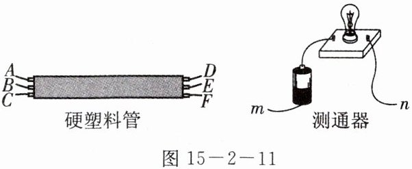 21. 如图15 - 2 - 11所示,在一根横跨河流两岸的硬塑料管内穿有三根完全相同的电线. 为了辨别哪两个线头为同一根导线的两端,可以用图示的测通器来测试,其操作过程如下: