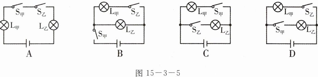 9. 击剑比赛中,当甲方运动员的剑(图中用“S甲”表示)击中乙方的导电服时,电路导通,乙方指示灯亮. 图15 - 3 - 5中能反映这种原理的电路是 ( )