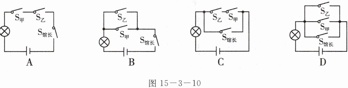 14. 某档案馆的保密室进出门有下列要求:甲、乙两资料员必须同时用各自的钥匙(S甲、S乙分别表示甲、乙两资料员的钥匙)使灯亮才能进入保密室;而馆长只要用自己的钥匙(S馆长表示馆长的钥匙)使灯亮就可以进入保密室. 图15 - 3 - 10所示电路中符合上述要求的是 ( )