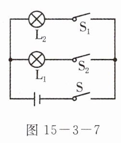11. 在并联电路中,干路上的开关作用是__________,支路上的开关作用是__________. 在图15 - 3 - 7的电路中,当开关S断开时,灯L₁、L₂都_______,若干路开关S闭合时,支路开关S₁闭合、S₂断开时,则灯_______亮,灯_______不亮.