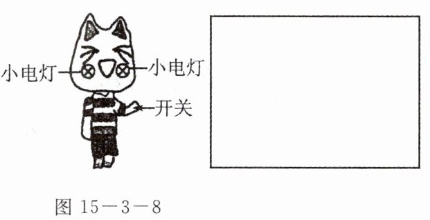 12. 一只玩具猫外形如图15 - 3 - 8所示,猫体内有电池,猫手相当于一开关,向下压猫手,猫脸上的两个小电灯会一起发光. 把你猜想的猫体内的电路图画在方框内.