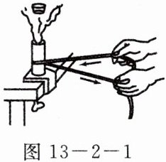 3. 如图13 - 2 - 1所示,将薄壁金属管固定在桌边,里面倒入一些酒精,用橡皮塞塞紧管口,拿绳子在管外绕几圈,迅速地来回拉动绳子,一会儿塞子嘭的一声被冲起. 关于这一现象,下列说法正确的是 ( )