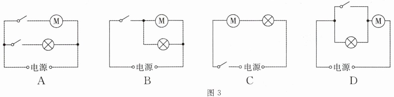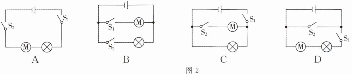 2.如图2所示,是2022年冬奥会闭幕式上控制舞台灯光与五环旗升降的电路原理图.闭合开关S₁,舞台灯亮起,按下开关S₂时,电动机才能启动控制五环旗升降;若舞台灯不亮,电动机也不启动.下列电路符合要求的是 ( )