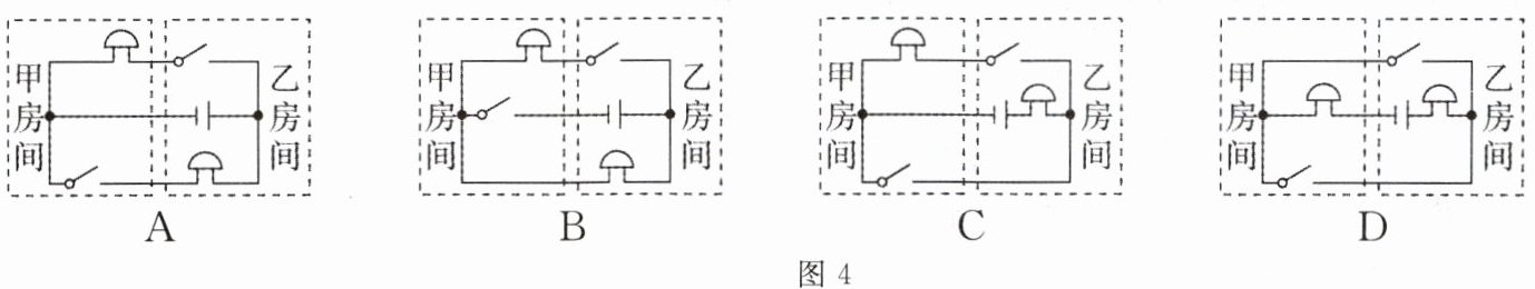 4.甲、乙为两个独立的房间,当闭合甲房间的开关时,只有乙房间电铃响;当闭合乙房间开关时,只有甲房间电铃响.图4中符合此要求的电路是 ( )