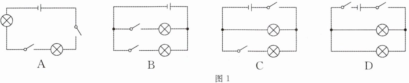 1.某班举办知识竞赛,需要制作一台选答器模型,要求如下:一个问题有两个可供选择的答案,选择哪一个答案就闭合哪一个开关,使对应的灯发光.下列图1所示电路中符合设计要求的是 ( )