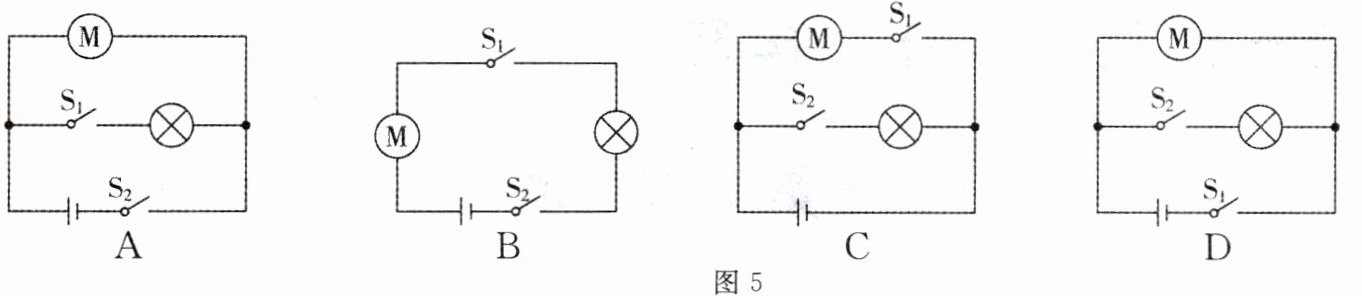 5.喜欢观察的小明发现,教室的投影仪内有一个降温风扇和一个投影灯泡,当闭合投影仪的电源开关S₁时,只有风扇工作,再闭合S₂时,灯泡和风扇同时工作.当只闭合S₂ 时,风扇和灯泡都不工作,图5所示电路设计符合要求的是 ( )