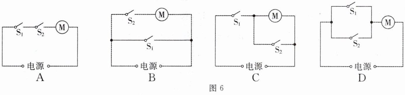 6.“一盔一带安全常在”,小佳想制作一款智能头盔,只有戴上头盔扣上卡扣后,头盔上的信号发射器才能发出信号,当电动车上的信号接收器(S₁)接收到信号,再转动电动车钥匙(S₂),车才能正常启动,图6所示电路中符合要求的是 ( )