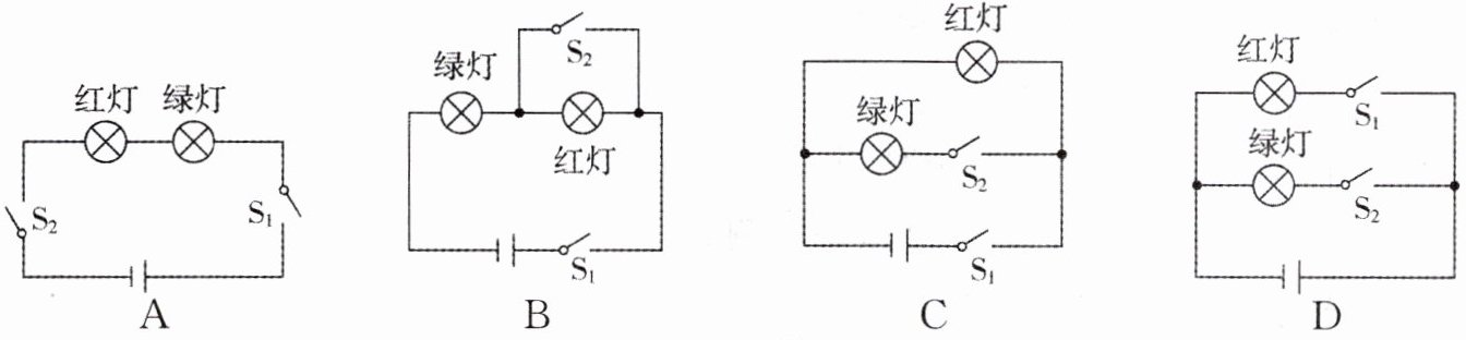 7.现代社会倡导文明出行,晓民同学观察人行横道信号灯,发现人行横道信号灯由红灯和绿灯组成,红灯停,绿灯行,图7画出的是控制人行横道红、绿灯的模拟电路图,你认为可行的是 ( )