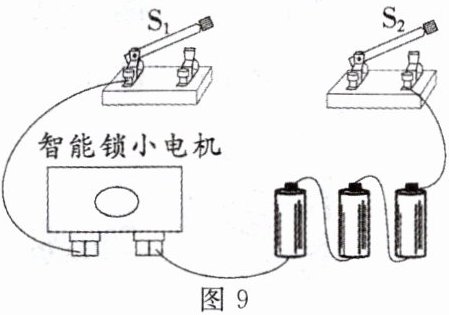 9.某门禁系统有两种识别方式:人脸识别(开关S₁)和密码识别(开关S₂),只要其中一种方式识别成功即可闭合相应开关,启动小电动机,开启门锁.请完成图9所示电路设计.