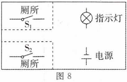 8.在火车上发现车厢后面有两个厕所,只有当两个厕所的门都关上时,车厢指示灯才会发光,指示牌才会显示“厕所有人”字样,请你把如图8中各元件符号连接成符合上述设计要求的电路图.