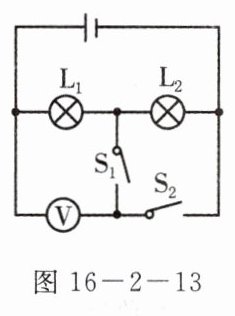 15. 如图16 - 2 - 13所示的电路中,当开关S₁闭合,S₂断开时,电压表的示数是3.8 V;当开关S₁断开,S₂闭合时,电压表的示数是6 V,则灯L₁两端的电压是_______ V;灯L₂两端的电压是_______ V;电源电压是_______ V.