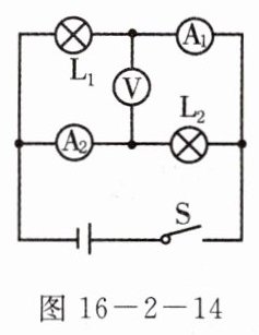 16. 如图16 - 2 - 14所示,开关S闭合后,电压表的示数为3 V,电流表A₁的示数为1 A,电流表A₂的示数为2 A,则灯泡L₁两端电压为_______ V,灯泡L₂两端电压为_______ V,电源两端的电压为_______ V,干路中电流为_______ A.