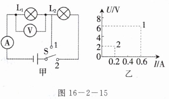 17. 如图16 - 2 - 15甲所示,当开关S由接1转到接2时,电压表示数变化如图乙所示,则电源电压是_______ V. 当开关S接2时,灯泡L₂两端的电压是_______ V,此时若灯L₁被短路,则电压表的示数为_______ V.