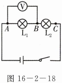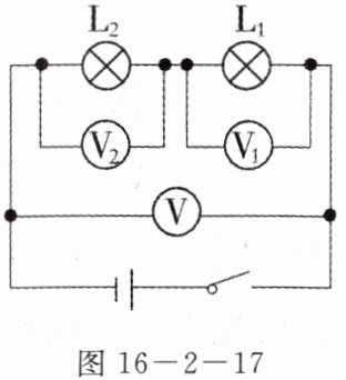 19. 在如图16 - 2 - 17所示电路中,闭合开关后电压表V₁的示数为2.5 V,V的示数为4.5 V,则电路的电源电压为_______ V,灯L₂两端电压为_______ V.