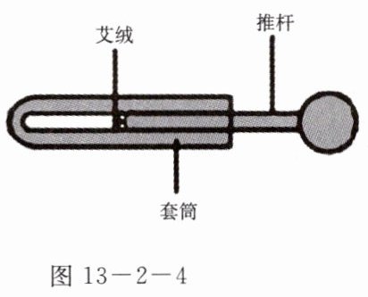 12. 如图13 - 2 - 4是我国古代发明的取火器的模型图,把木制推杆迅速推入牛角套筒时,杆前端的艾绒立刻燃烧起来,这是通过________的方式,使筒内空气内能______,温度升高,达到艾绒的着火点.
