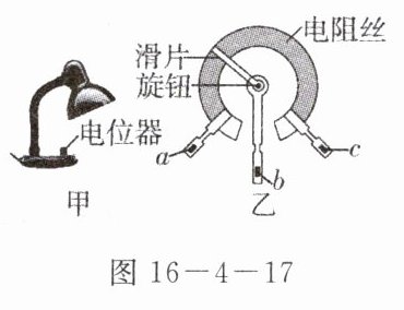 20. 如图16 - 4 - 17所示,甲为亮度可调的台灯,电位器是调节其亮度的装置;乙为电位器的内部结构示意图,a、b、c是它的三个接线柱,旋钮带动滑片转动. 若顺时针旋转旋钮时灯泡发光变亮,则需将______________(选填“a和b”、“a和c”或“b和c”)接线柱接入电路. 关于电位器上电阻丝的材料,应该选用______________(选填“铜丝”或“镍铬合金丝”).